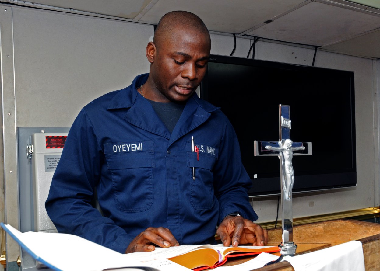 305k | 16 February 2012: Lagos, Nigeria - Interior Communications Electrician 1st Class David Young, assigned to the guided-missile frigate Simpson, hands books