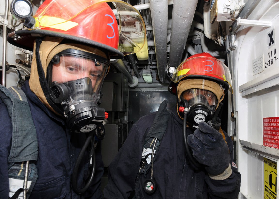 firefighting training evolution aboard the guided-missile frigate Simpson. (U.S. Navy photo #120418-N-RN782-108 by MCSN Brian T. Glunt from the Navy Newstand) | ||