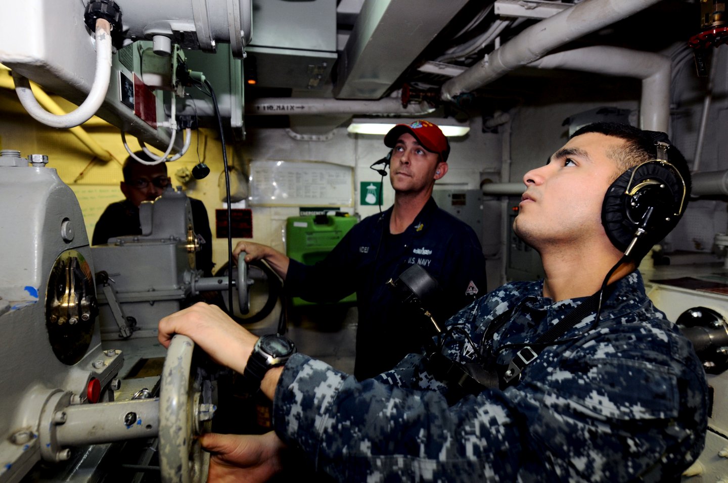 211k | 18 April 2012: the Atlantic Ocean - Chief Gas Turbine Systems Technician (Electrical) Eric Aguirre listens as Gas Turbine Systems Technician (Mechanical) Fireman Dylan Lewis