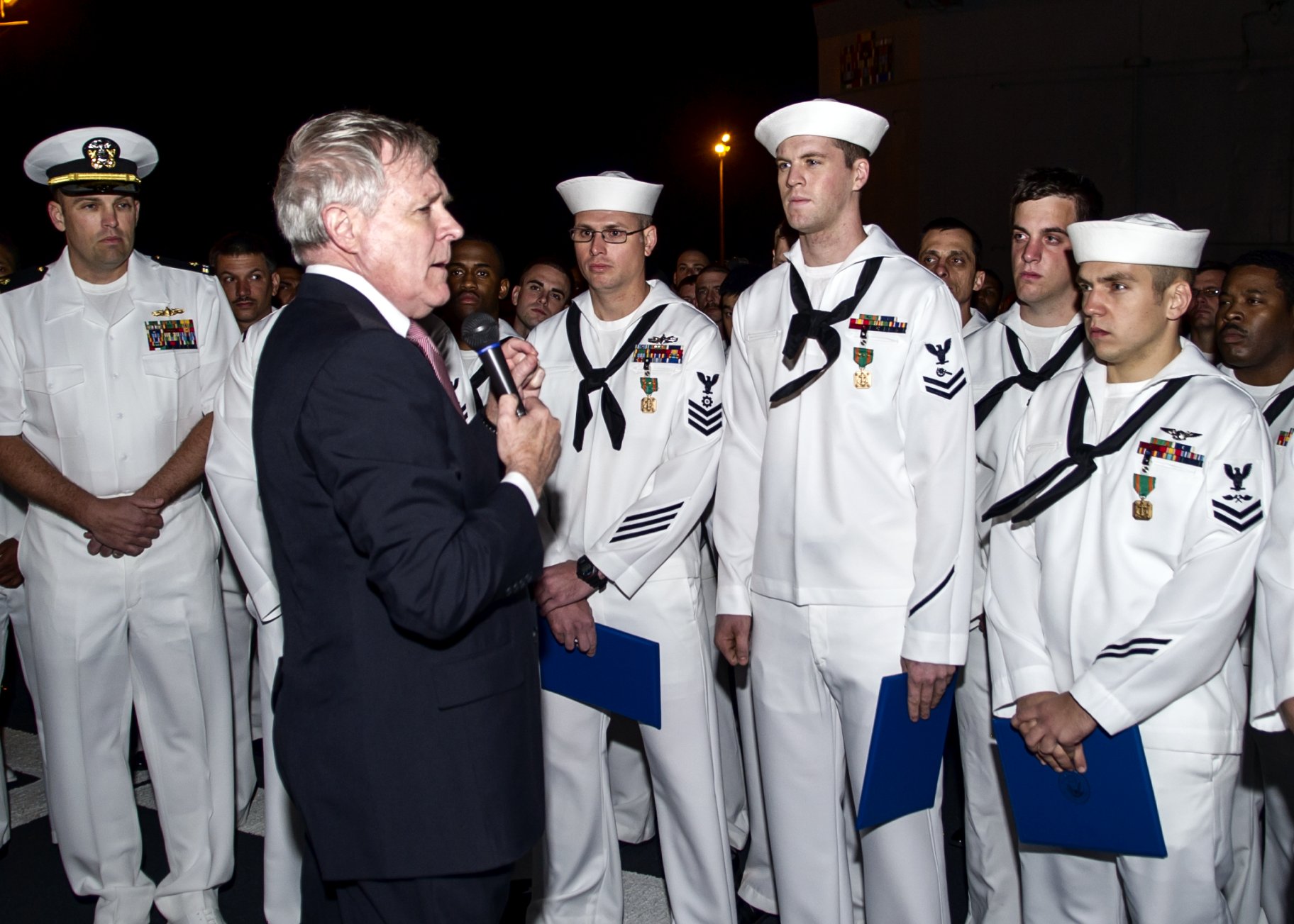 281k | 10 April 2012: Cape Verde - Secretary of the Navy the Honorable Ray Mabus speaks with sailors during an all-hands call aboard the guided-missile frigate Simpson.