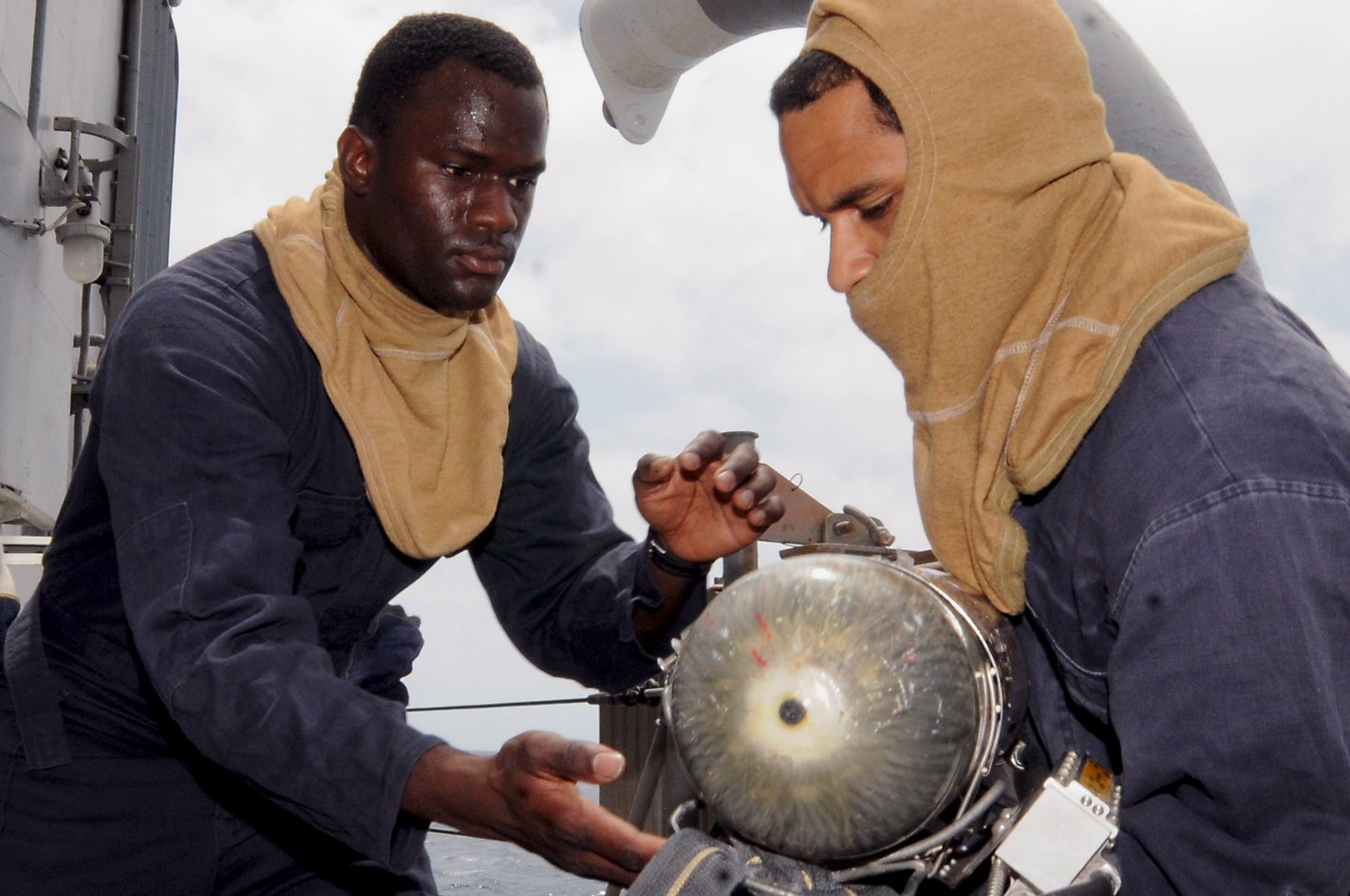 191k | 28 April 2012: the Atlantic Ocean - Culinary Specialist 1st Class Richard Williford, left, and Yeoman 3rd Class Coleman Gentry complete a functional safety check aboard the