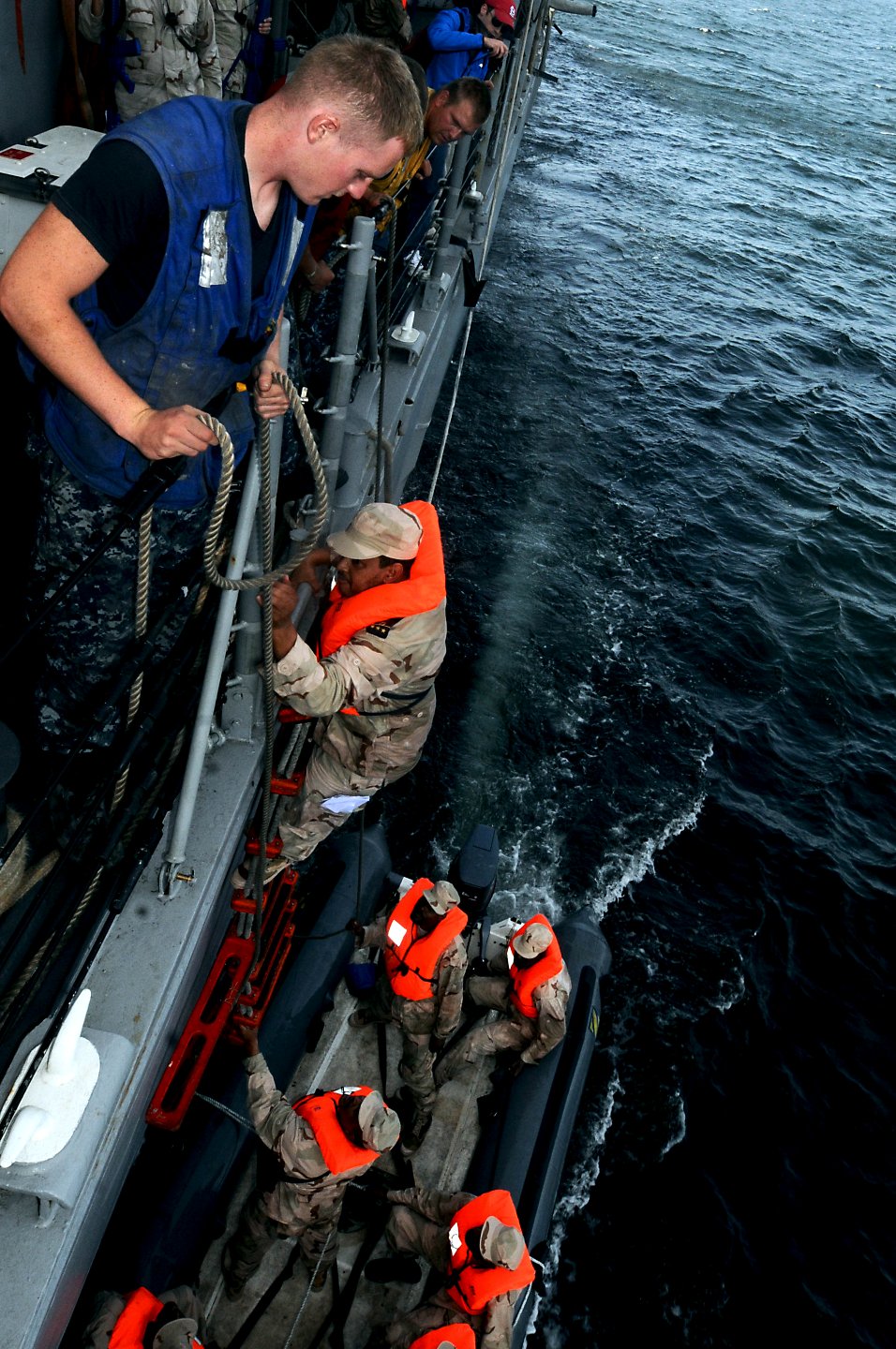 336k | 26 April 2012: the Atlantic Ocean - Seaman Clayton Grauel mans a pilot's ladder as members of the Mauritania's navy boarding team climb aboard the guided-missile frigate