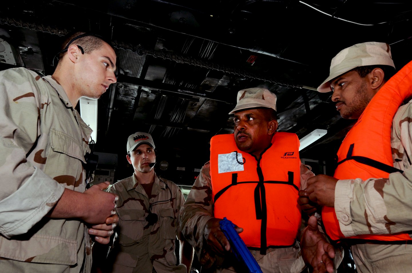 Mate Khalil Jerrah, team leader of Mauritania's navy boarding team, and Lt. Mhd Yahya Sidiya on the bridge of the ship during an exercise supporting Saharan Express 2012. Saharan Express is