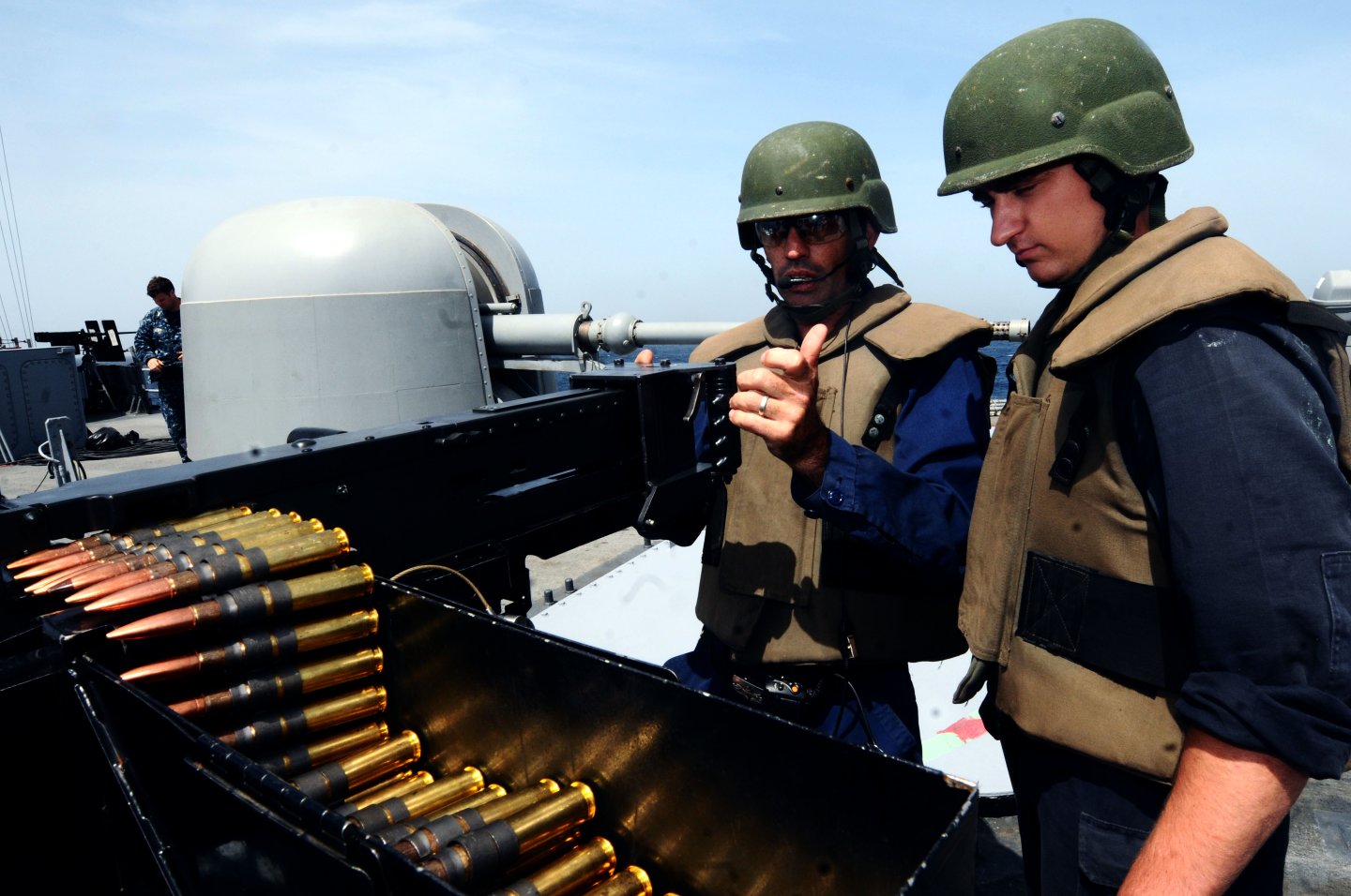 242k | 28 April 2012: the Atlantic Ocean - Chief Gunner's Mate Sean Holmes loads ammunition into a .50-caliber machine gun before a pre-action aim calibration test-fire exercise