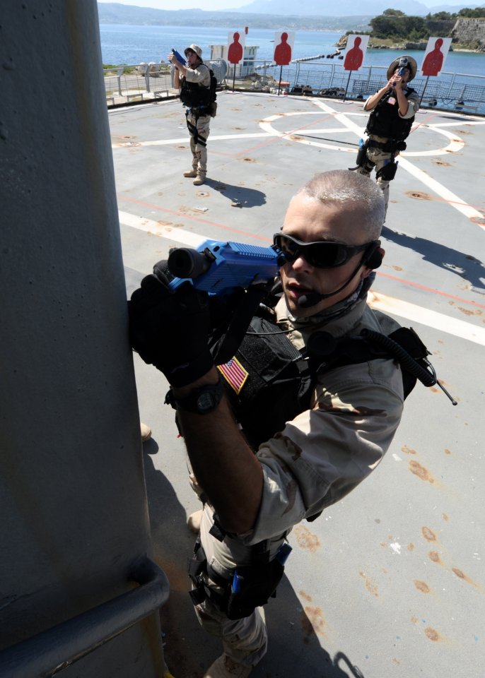 106k | 09 May 2012: Souda Bay, Crete - Chief Fire Controlman Timothy Wheeler, a member of the boarding team from the guided-missile frigate Simpson, secures a stairway during