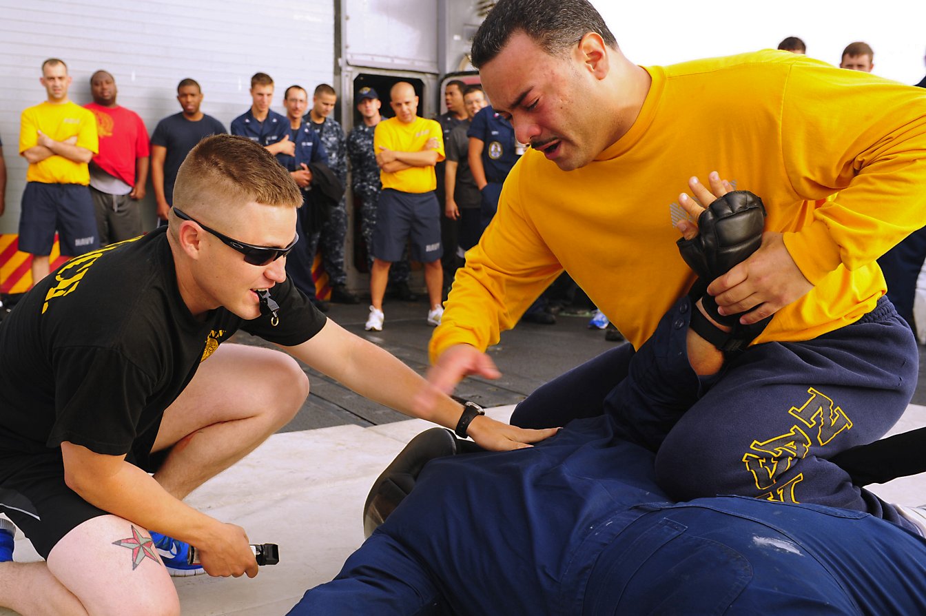 197k | 23 June 2012: the Atlantic Ocean - Chief Cryptologic Technician (Technical) Juan Davila simulates arresting Boatswain's Mate 1st Class Dustin Nugent as Master-at-Arms 1st Class
