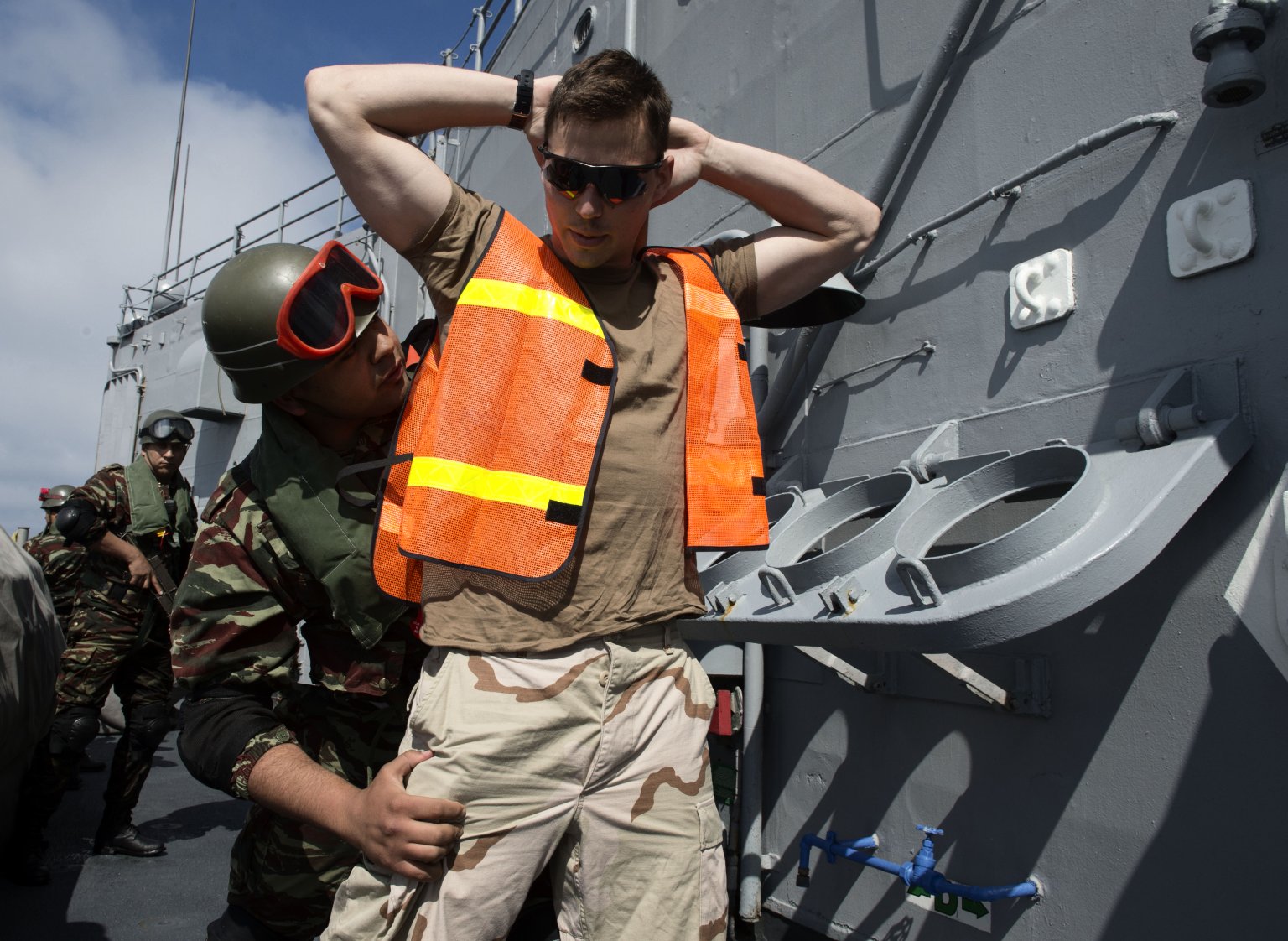 searches a sailor playing the role of a cargo ship crew member during a passing exercise aboard the guided-missile frigate Simpson. (U.S. Navy photo #140306-N-SK590-219 by MC2 Tim D. Godbee from the Navy Newstand) |