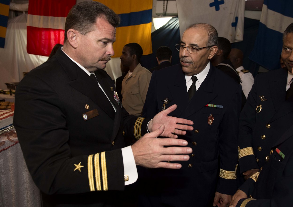 127k | 07 March 2014: Casablanca, Morocco - Commander Christopher Follin, left, commanding officer of the guided-missile frigate Simpson, speaks with guests at a
