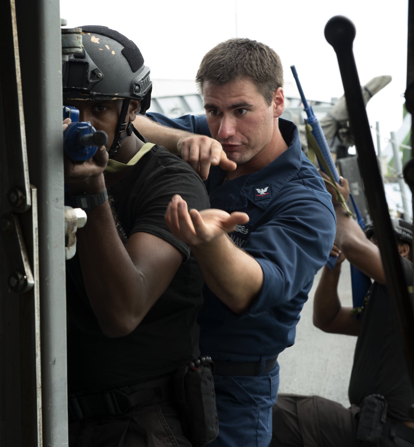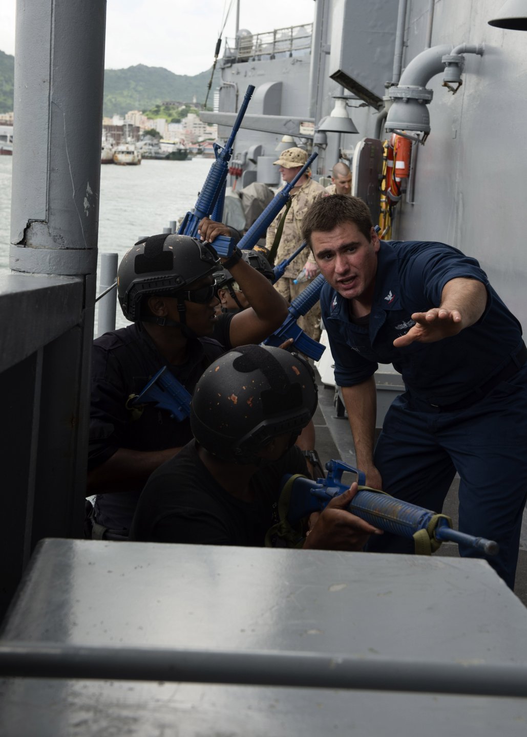 186k | 30 January 2015: Port Louis, Mauritius - Two views of Operations Specialist 3rd Class Brian Darby, from New York City, instructing Mauritian boarding team members during a