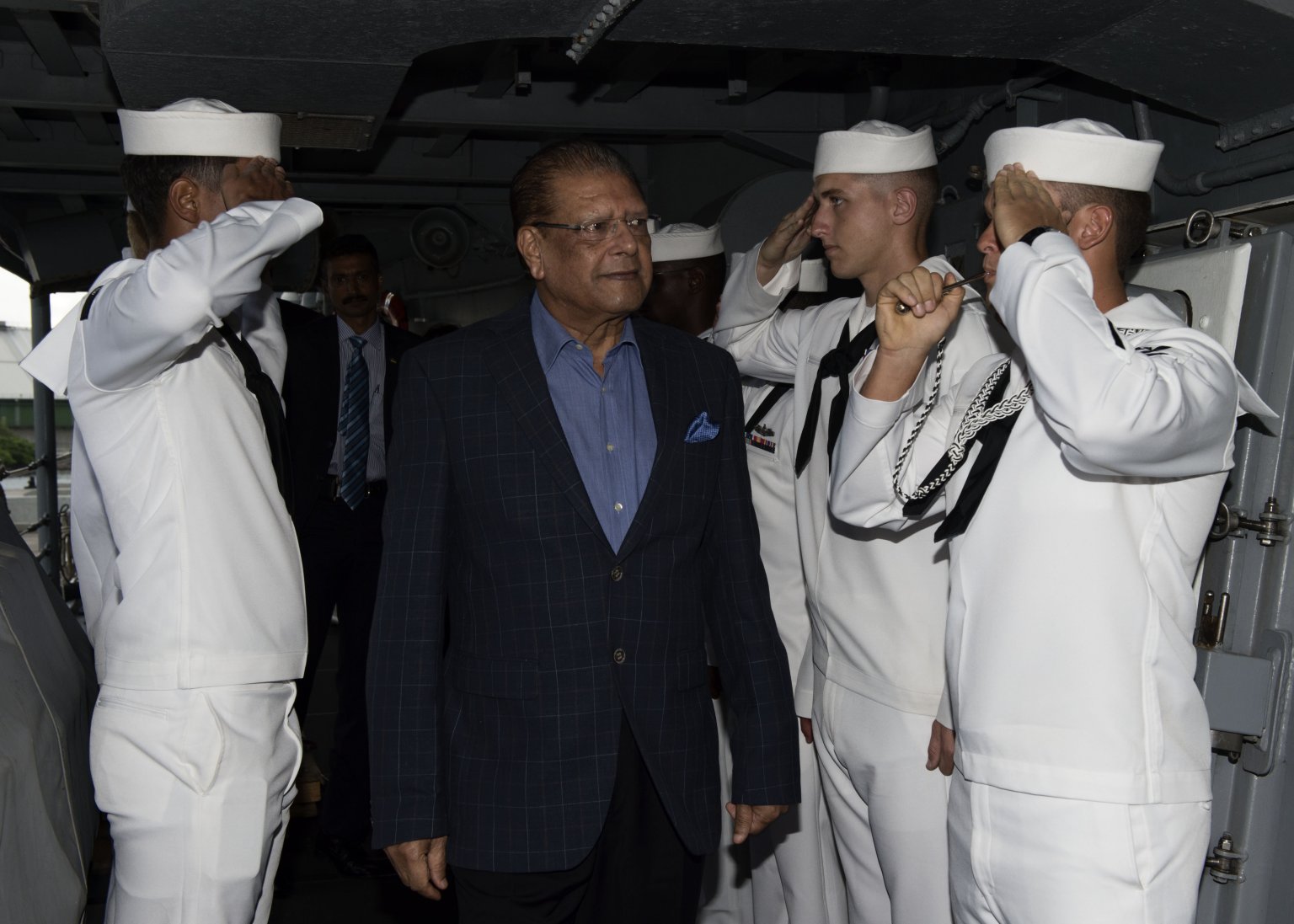 193k | 03 February 2015: Port Louis, Mauritius - Mauritius President Kailash Purryag is piped aboard the Oliver Hazard Perry-class guided-missile frigate Simpson.