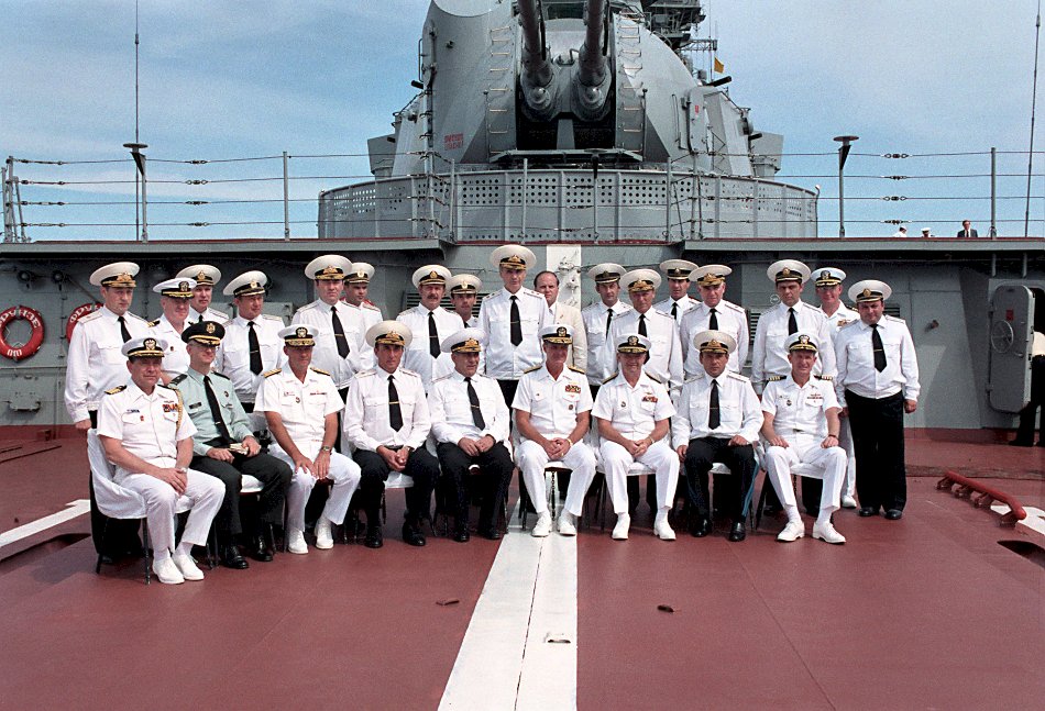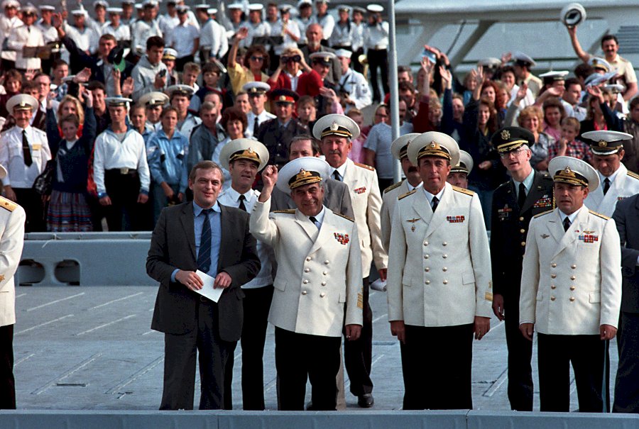 left, Commander in Chief, U.S. Pacific Fleet; Admiral Gennadi Khvatov, fourth from right, Commander Soviet Pacific Fleet. (U.S. Navy photo DVID #DN-SC-91-02271 by PHCS Terry Mitchell) | |||