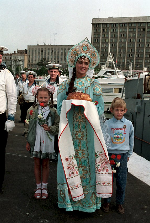 140k | September 1990: Vladivostok USSR - Flanked by two children, a woman wearing ethnic dress holds a tray of bread and salt in a traditional gesture of welcome. Two US Navy ships,