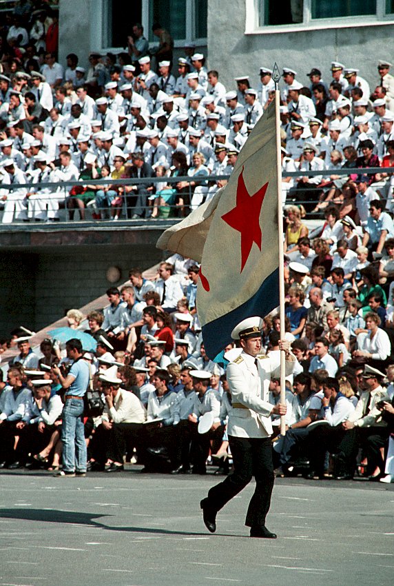 165k | September 1990: Vladivostok USSR - An officer carries the Soviet naval ensign at the start of a military demonstration held for Soviet citizens and visiting American sailors. (U.S. Navy photo DVID #DN-ST-91-00737 by PH1 Ted Salois) | |||