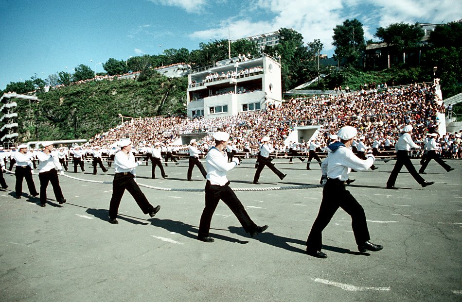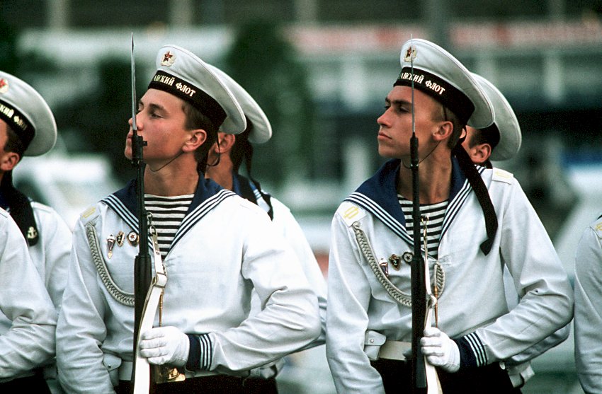 154k | September 1990: Vladivostok USSR - Soviet sailors march at trail arms during a military demonstration held for Soviet citizens and visiting American sailors. (U.S. Navy photo DVID #DN-ST-91-00738 by PH1 Ted Salois) | |||