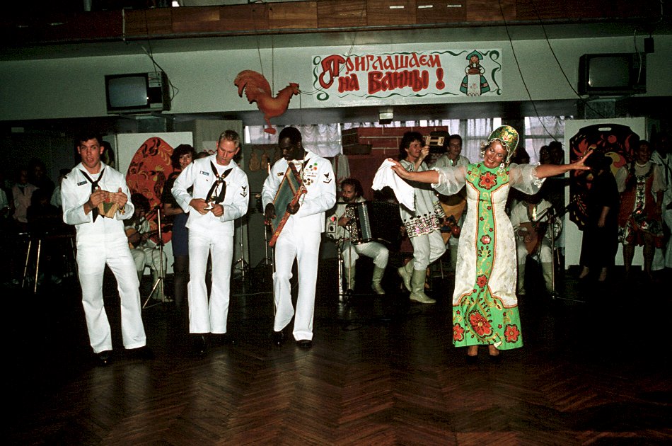000k | September 1990: Vladivostok USSR - American sailors join a Soviet group to provide music during a reception held for enlisted men from Princeton and Reuben James. (U.S. Navy photo DVID #DN-ST-91-00736 by PH1 Ted Salois) | |||