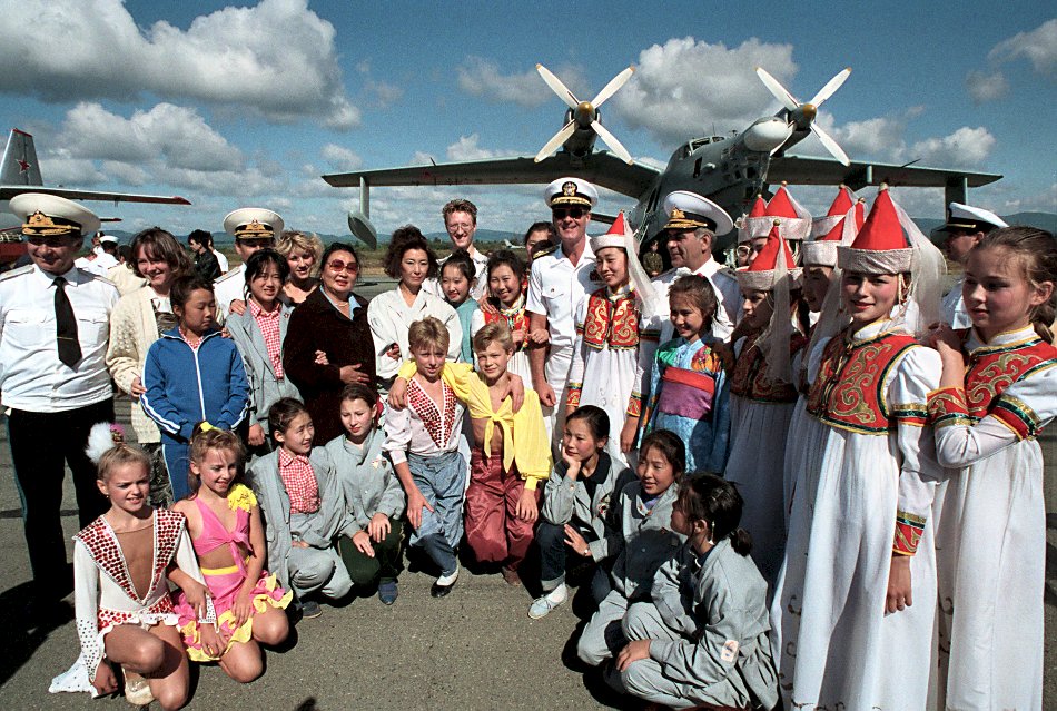 acific Fleet, gather in front of a Be-12 Mail aircraft with members of a cultural troupe during a visit to an air base. Larson is in the Soviet Union with two US Navy ships, Princeton