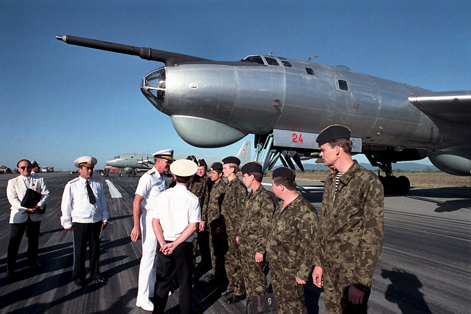 147k | September 1990: Vladivostok USSR - Admiral Charles R. Larson, Commander in Chief, US Pacific Fleet, inspects several Soviet naval infantrymen near a Tu-95 Bear D aircraft during