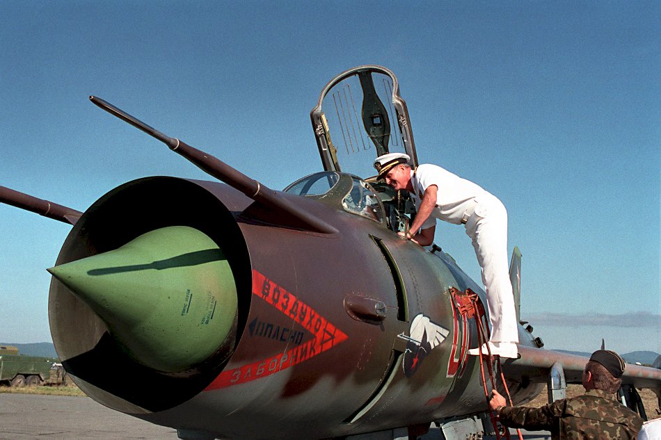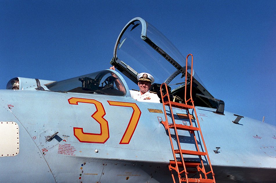 117k | September 1990: Vladivostok USSR - Admiral Charles R. Larson, Commander in Chief, US Pacific Fleet, looks into the cockpit of a Soviet Su-17 Fitter aircraft during a visit to