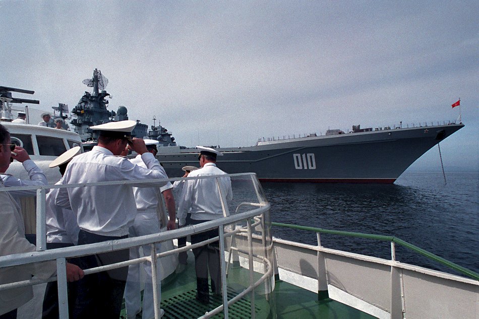 134k | September 1990: Vladivostok USSR - An American officer aboard a barge watches as the craft approaches the Soviet nuclear-powered guided missile cruiser Frunze. The