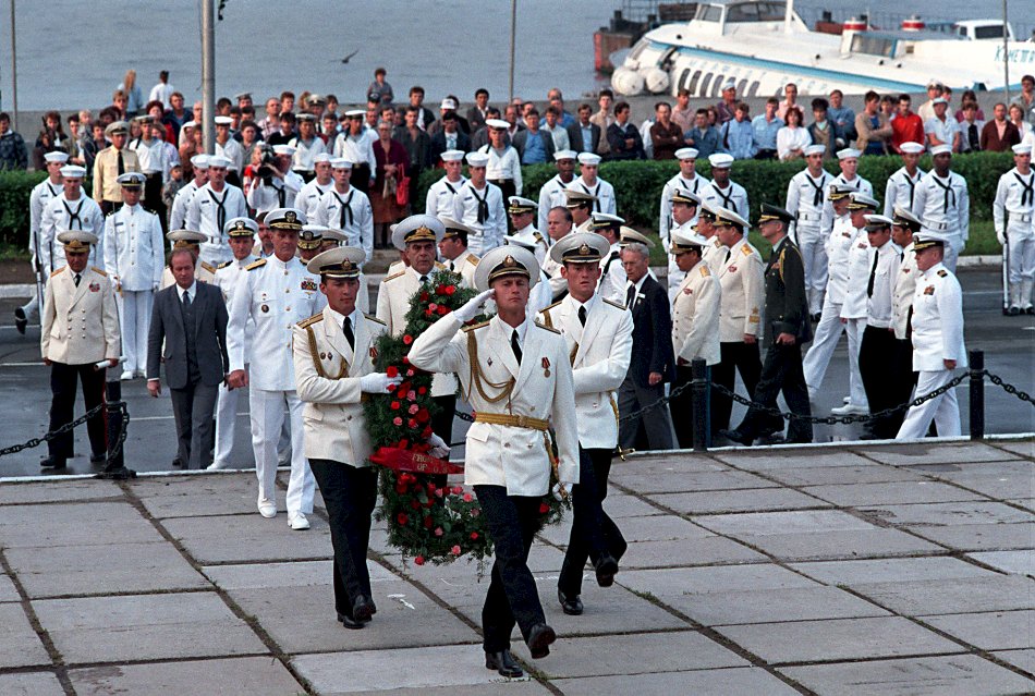 190k | September 1990: Vladivostok USSR - A Soviet navy honor guard carries a wreath to the base of a war memorial. Directly behind the honor guard are Admiral Charles R. Larson, left,