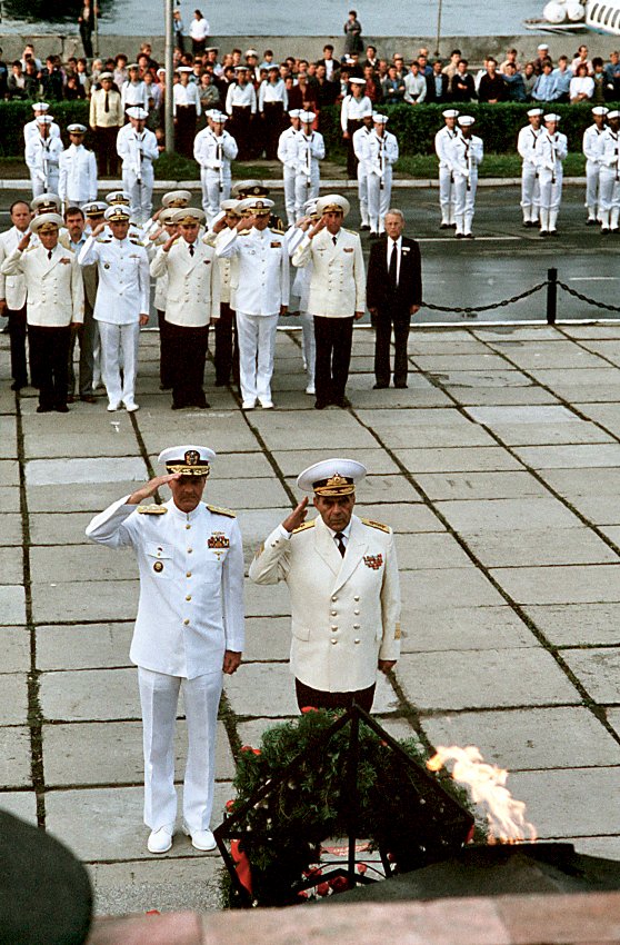 salute during a wreath-laying ceremony honoring the Soviet Union's war dead. (U.S. Navy photo DVID #DN-ST-91-00725 by PH1 Ted Salois) | |||