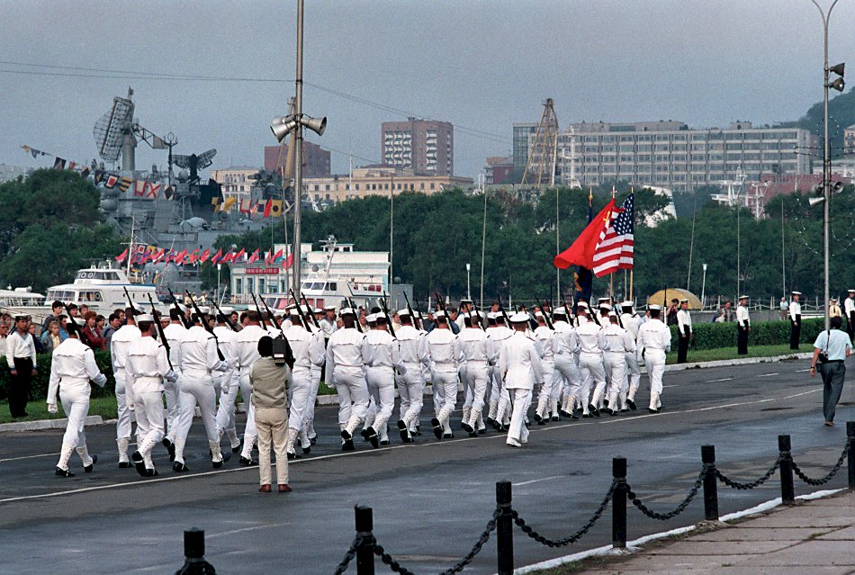 179k | September 1990: Vladivostok USSR - A contingent of American sailors marches along a road following a wreath-laying ceremony at a Soviet war memorial. (U.S. Navy photo DVID #DN-SC-91-02238 by PHCS Terry Mitchell) | |||