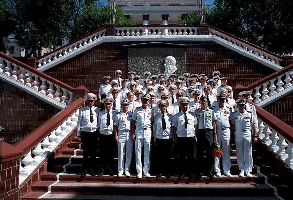 203k | September 1990: Vladivostok USSR - Admiral Charles R. Larson, center, Commander in Chief, US Pacific Fleet, and Admiral Gennadi Khvatov, right center, Commander, Soviet