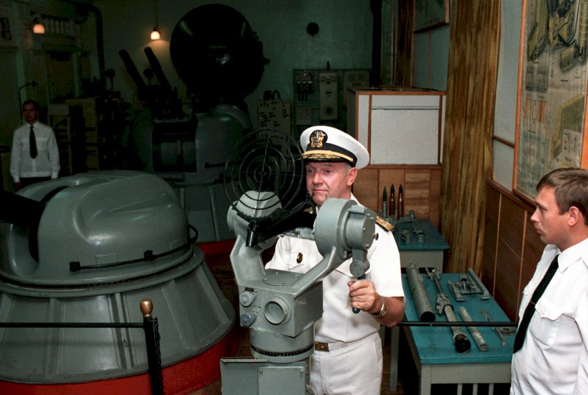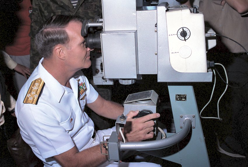 105k | September 1990: Vladivostok USSR - Admiral Charles R. Larson, Commander in Chief, U.S. Pacific Fleet, looks through a gunner's sight simulator at a Soviet navy service school