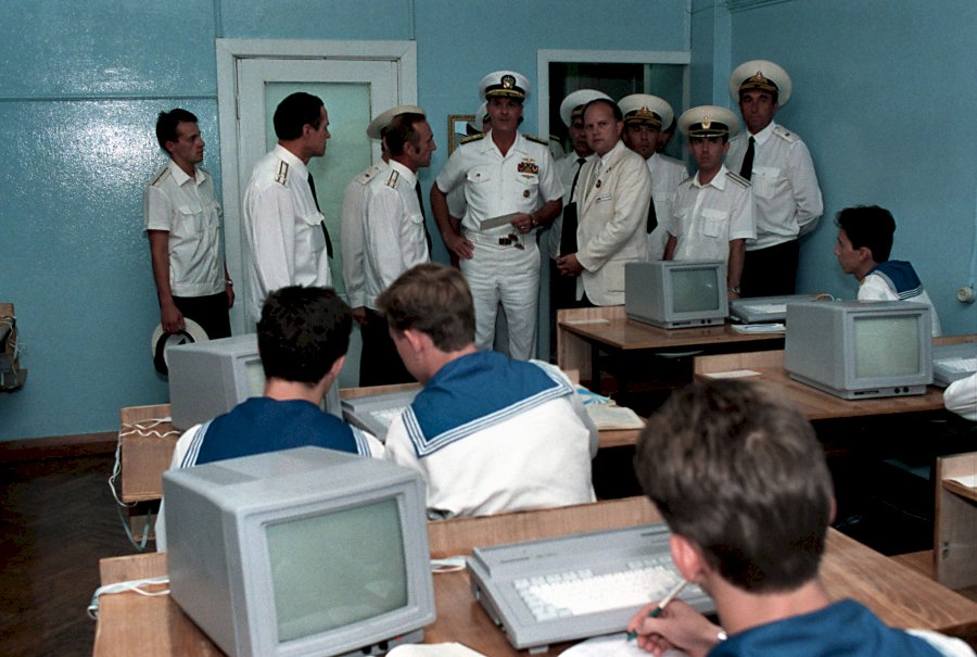 105k | September 1990: Vladivostok USSR - Admiral Charles R. Larson, Commander in Chief, U.S. Pacific Fleet, looks in on a computer class at a Soviet navy service school during a visit