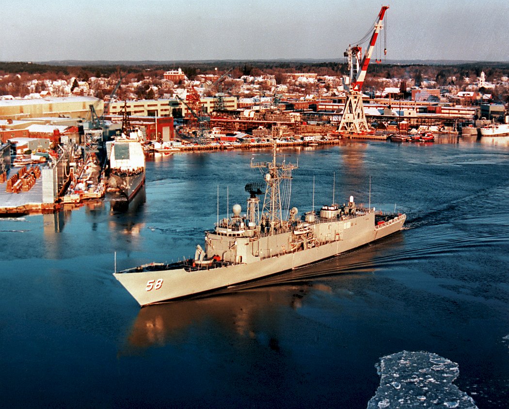 268k | 04 February 1986: Kennebec River, Me. - A port bow view of Samuel B. Roberts as it heads down the icy Kennebec River to sea trials. (U.S. Navy photo DVID #DN-SC-89-00173 by Bath Iron Works, Inc. from the DVIC) | ||