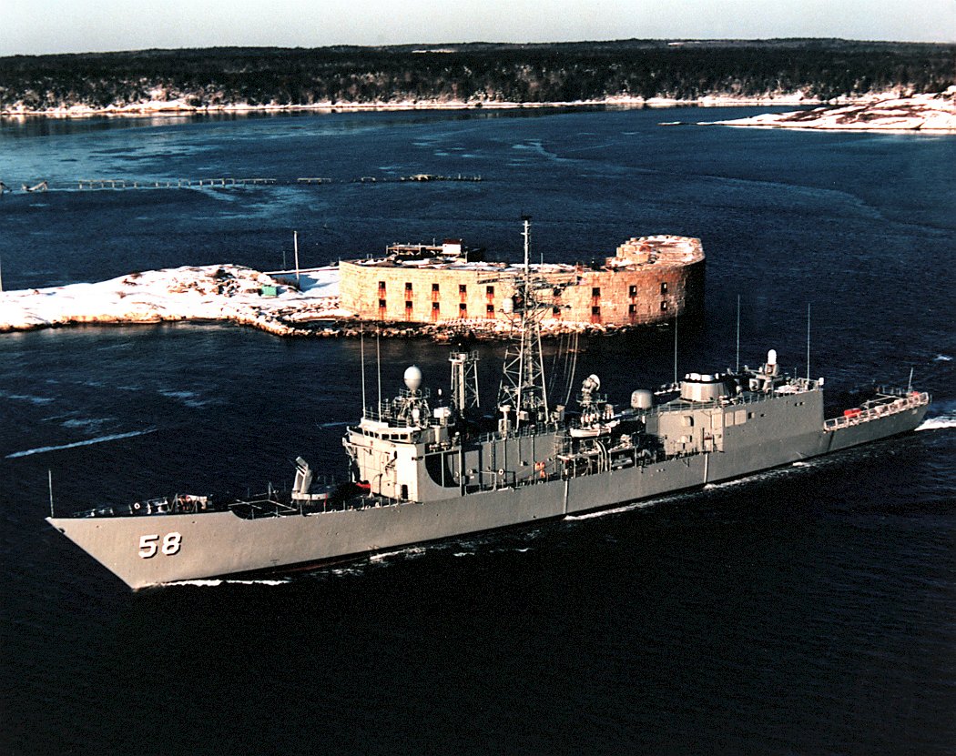 251k | 04 February 1986: Kennebec River, Me. - A port bow view of Samuel B. Roberts as it passes an old coastal fort during sea trials. (U.S. Navy photo DVID #DN-SC-89-00174 by Bath Iron Works, Inc. from the DVIC) | ||