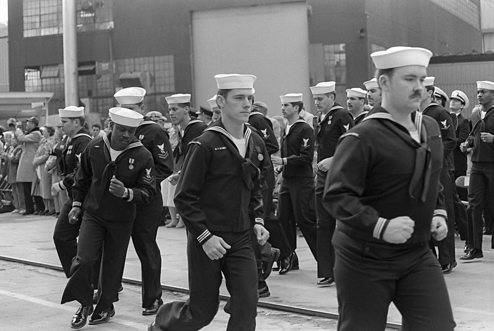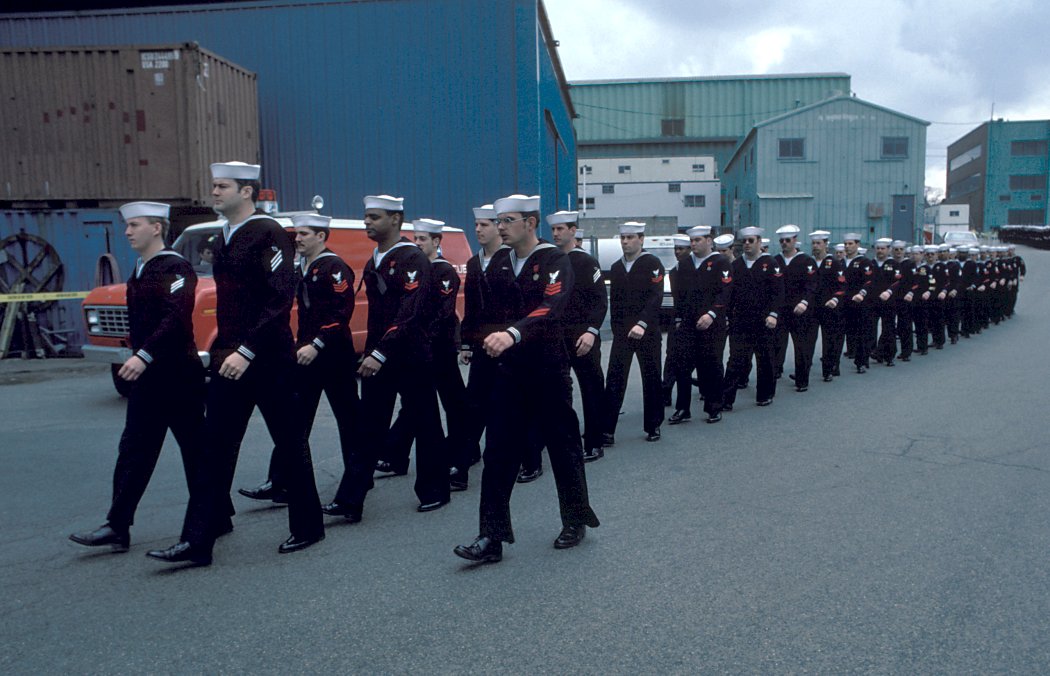 128k | 12 April 1986: Bath, Me. - Crew members march in formation during the commissioning ceremony. (U.S. Navy photo DVID #DN-ST-86-06796 by PH2 Alexander C. Hicks, Jr. from the DVIC) | ||