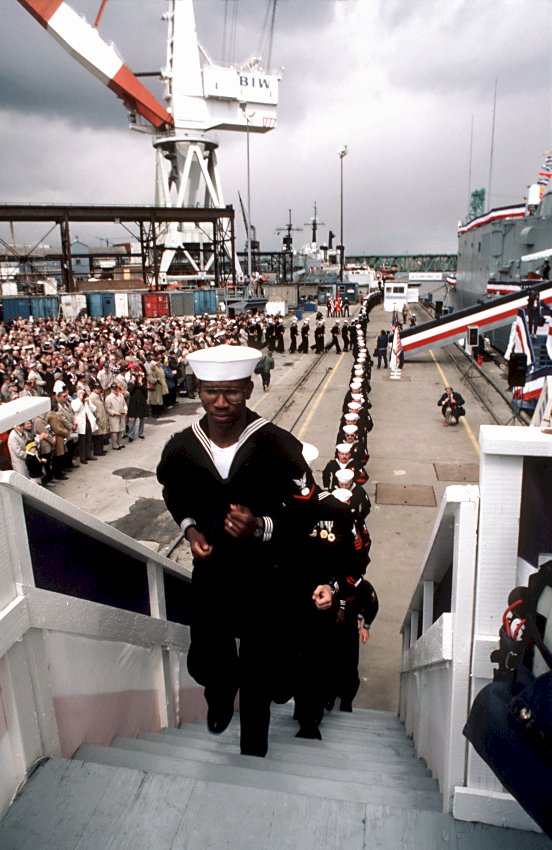 134k | 12 April 1986: Bath, Me. - Crew members run to man the ship during the commissioning ceremony. (U.S. Navy photo DVID #DN-SN-86-05736 by PH2 K. Tharpe from the DVIC) | ||