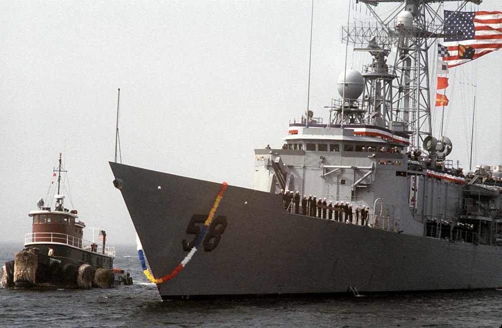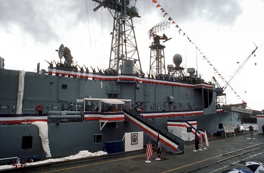 99k | 12 April 1986: Bath, Me. - Crew members raise their hats in a salute while manning the rails during the commissioning ceremony. (U.S. Navy photo DVID #DN-ST-86-06821 by PH2 Alexander C. Hicks, Jr. from the DVIC) | ||