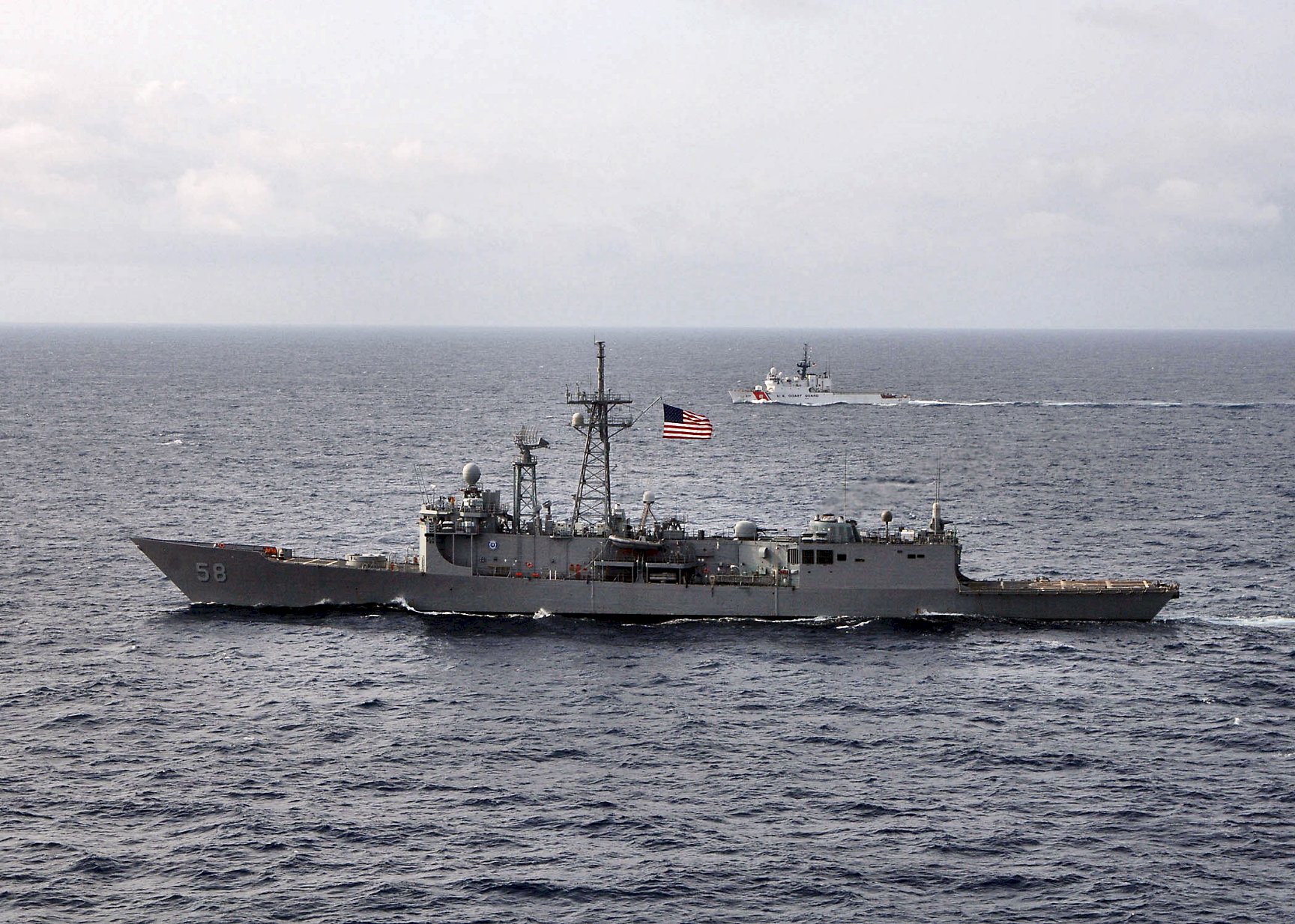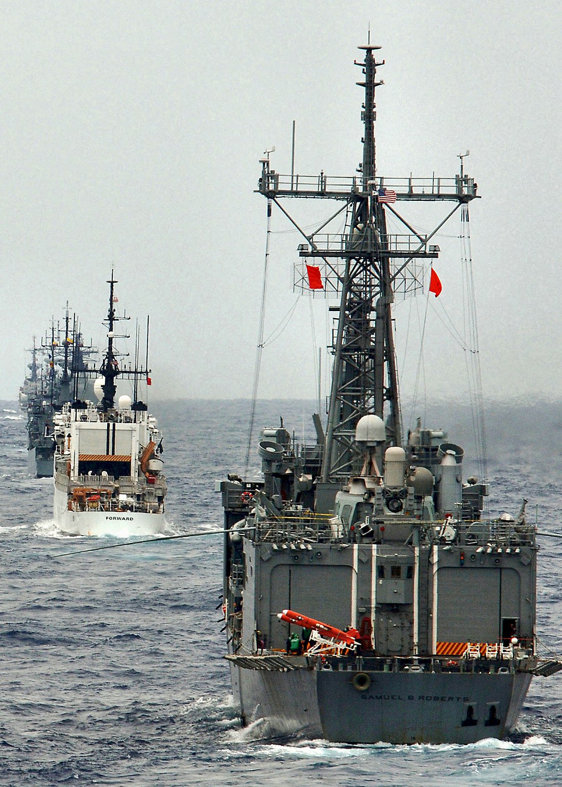 495k | 11 July 2005: Pacific Ocean - The guided missile frigate Samuel B. Roberts underway along side the U.S. Coast Guard cutter USCG Forward