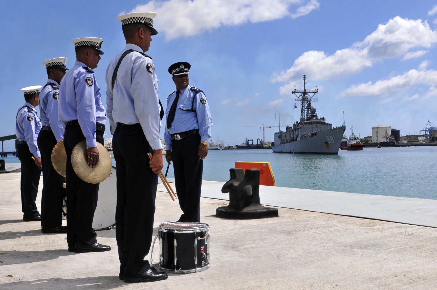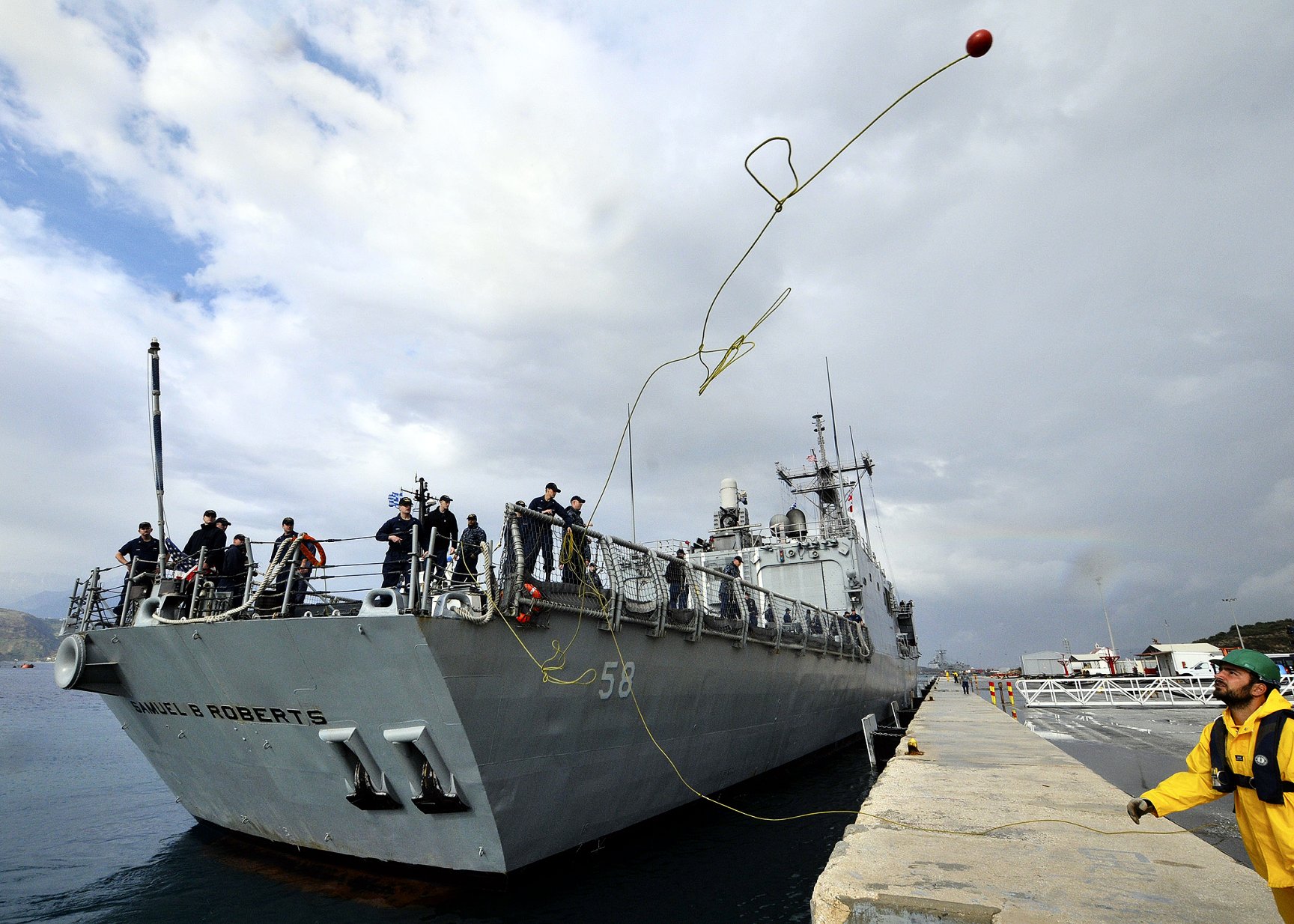 378k | 10 May 2013: Souda Bay, Greece - A messenger line is heaved ashore as the guided-missile frigate USS Samuel B. Roberts (FFG 58) arrives for a port visit. (U.S. Navy photo #130510-N-MO201-065 by Paul Farley from the Navy News Stand) | ||
