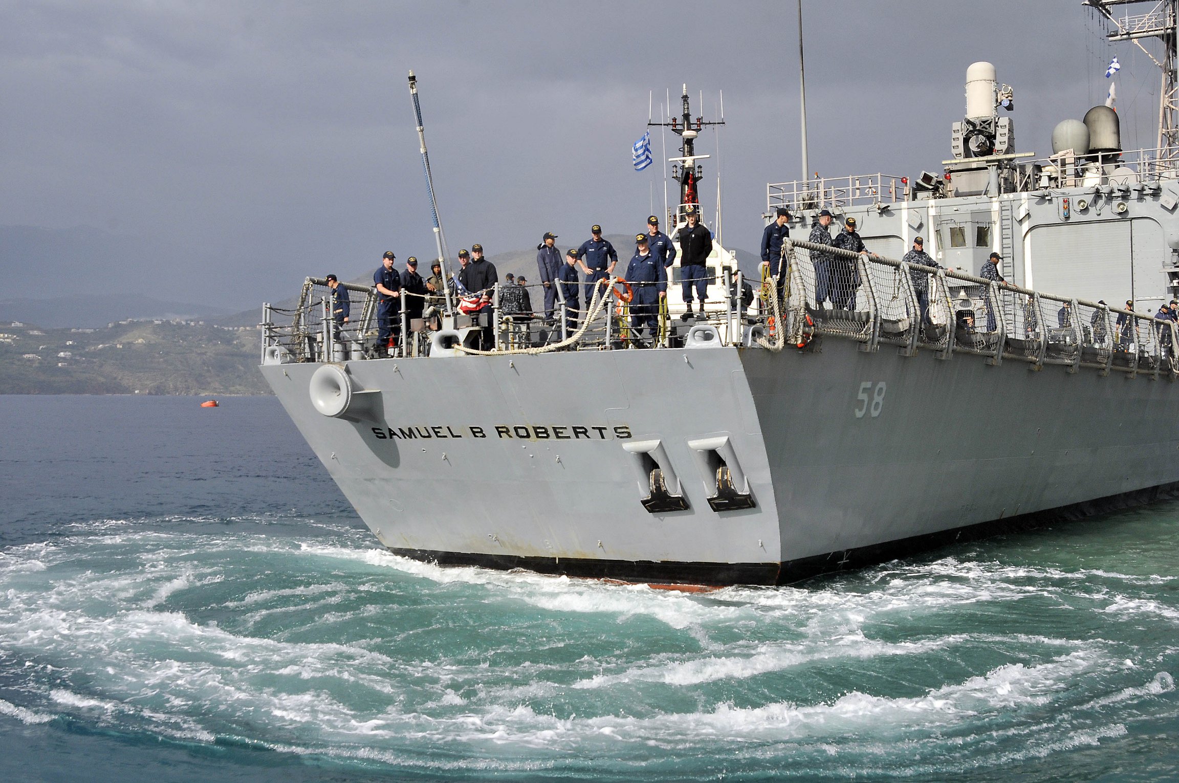 223k | 23 November 2011: Souda Bay, Greece - The guided-missile frigate USS Samuel B. Roberts arrives for a routine port visit to Crete. (U.S. Navy photo #111123-N-MO201-057 by Paul Farley from the Navy News Stand) | ||
