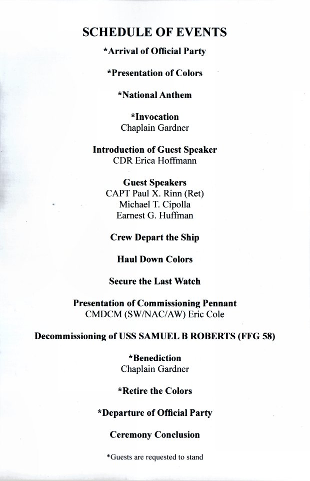of Samuel B. Roberts at Naval Station Mayport. Samuel B. Roberts was commissioned in April 1986, its decommissioning marks 29 years of service. (U.S. Navy photo #150522-N-RX128-023 by MCSN Nathan Lang from the Navy News Stand) | ||