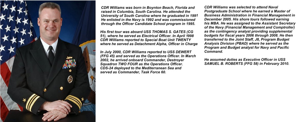 | 16.) 19 Jan. 2012 - 24 Jul. 2013 | Cmdr. Robert Rambo Williams (enl. '92 / OCS '95) (Columbia, S.C.) |