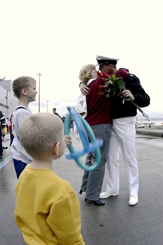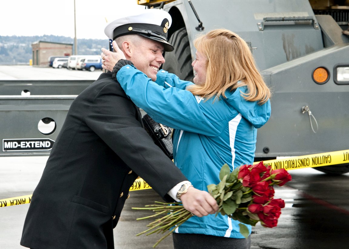 188k | 09 March 2012: Everett, Wash. - Chief Sonar Technician (Surface) Paul Dammon greets his wife after the guided-missile frigate Ingraham