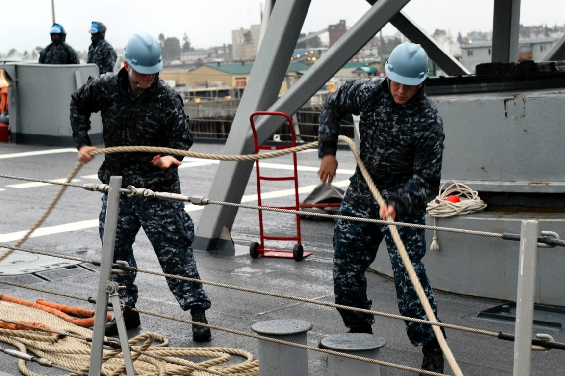 112k | 26 September 2011: Everett, Wash. - Sailors aboard the guided-missile frigate Ingraham haul in lines to get underway for a scheduled