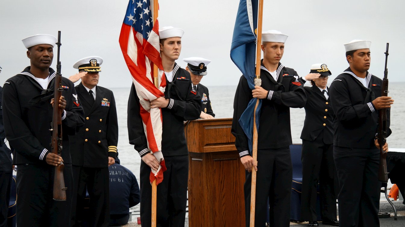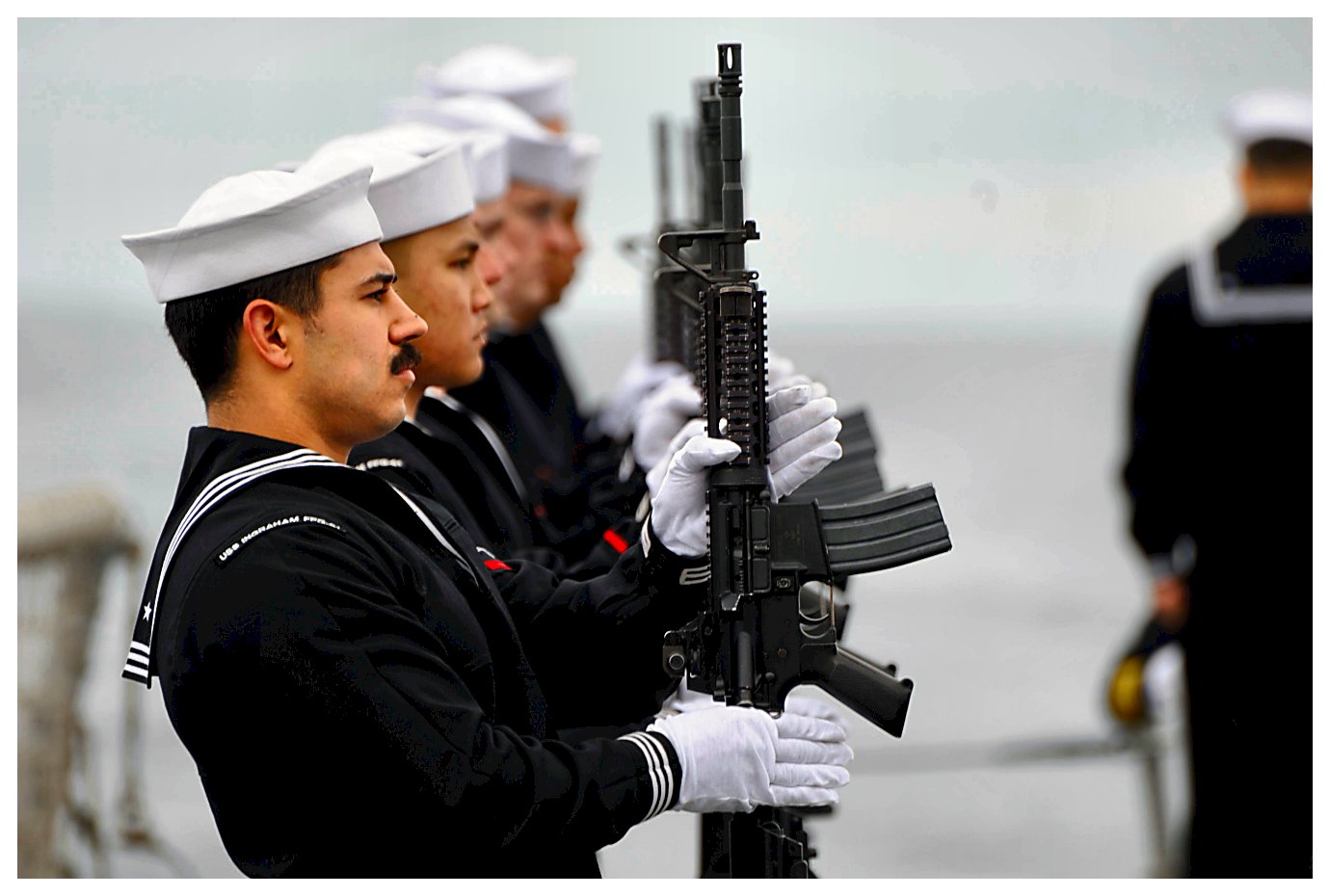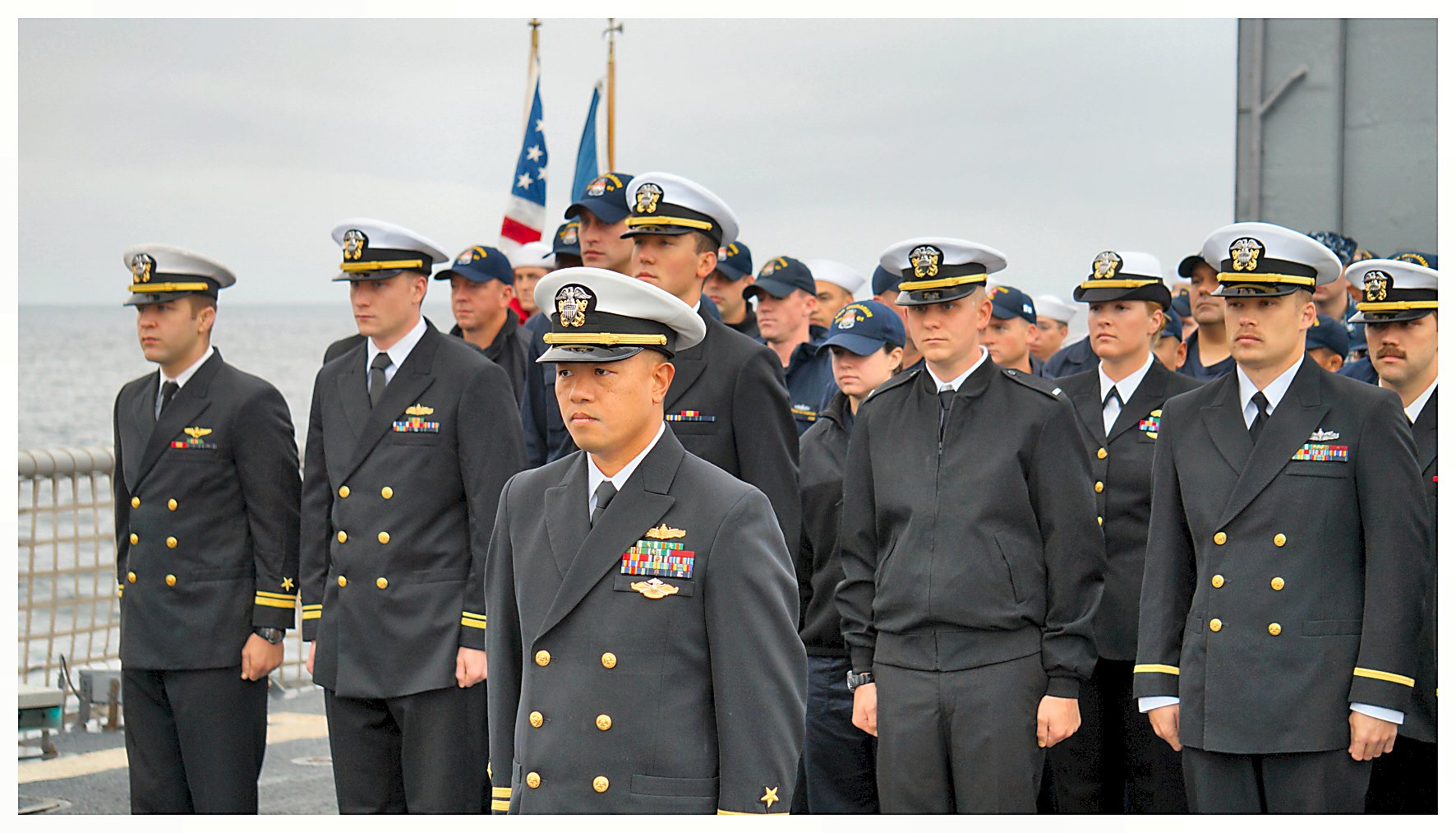131k | 26 January 2014: the Pacific Ocean – Sailors aboard the guided missile frigate USS Ingraham (FFG 61) take part in a burial at sea ceremony. During the ceremony, the cremains of 23 Sailors, Marines, Soldiers, Airmen and two military spouses were committed to the sea. (U.S. Navy photo #140126-N-ZZ999-061 from the Naval Surface Warriors - Flickr) | ||