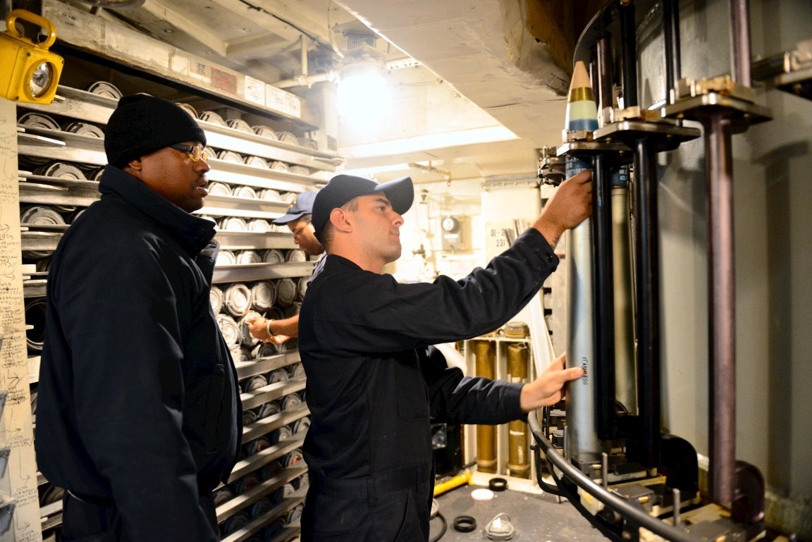 165k | 12 September 2014: The Pacific Ocean - Seaman Zohair Haddad, assigned to Ingraham receives instruction from Chief Gunners Mate Wilford Smith