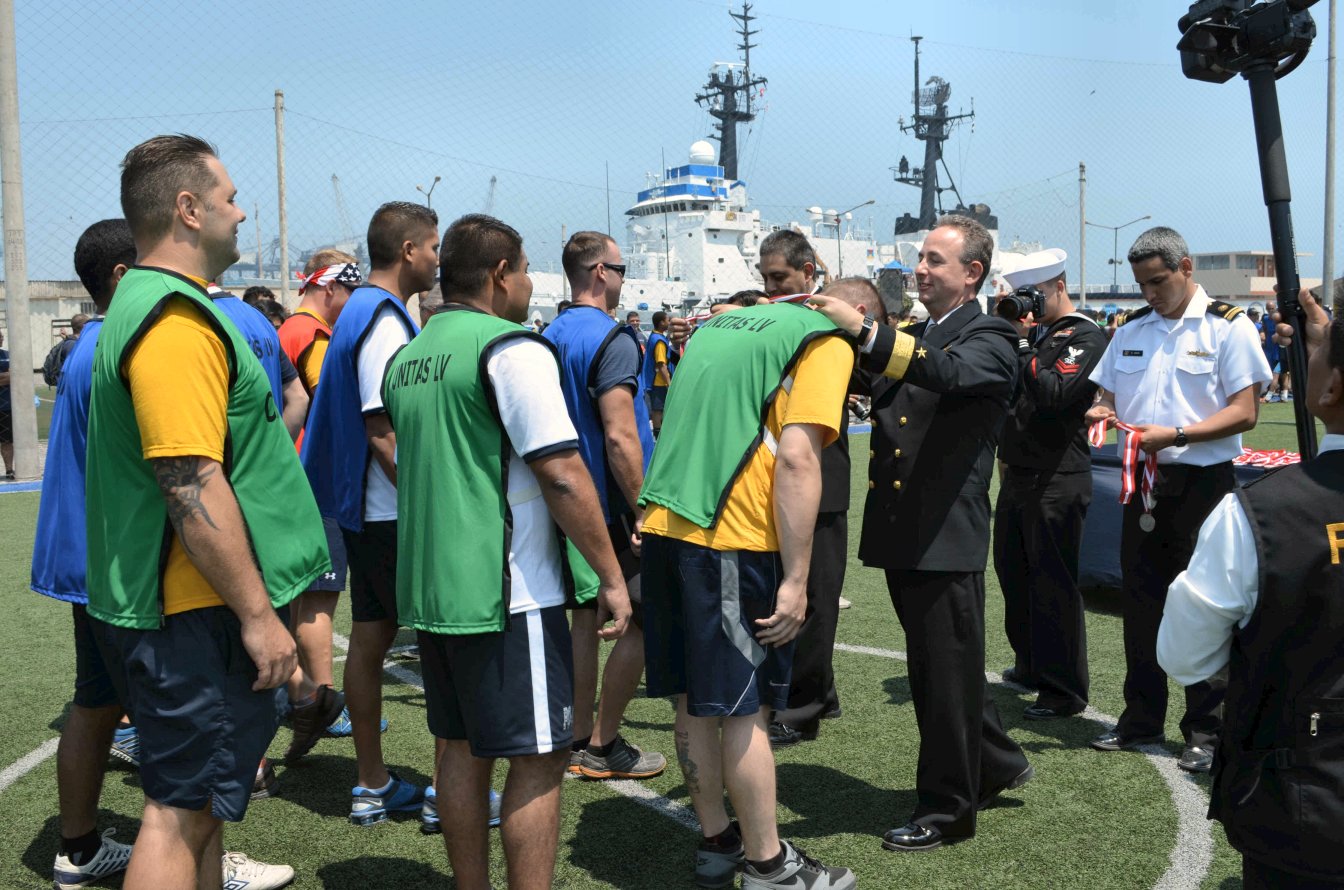 249k | 16 September 2014: Callao, Peru - Rear Adm. Jon G. Matheson, deputy commander of U.S. Naval Forces Southern Command/U.S. 4th Fleet, awards medals to sailors