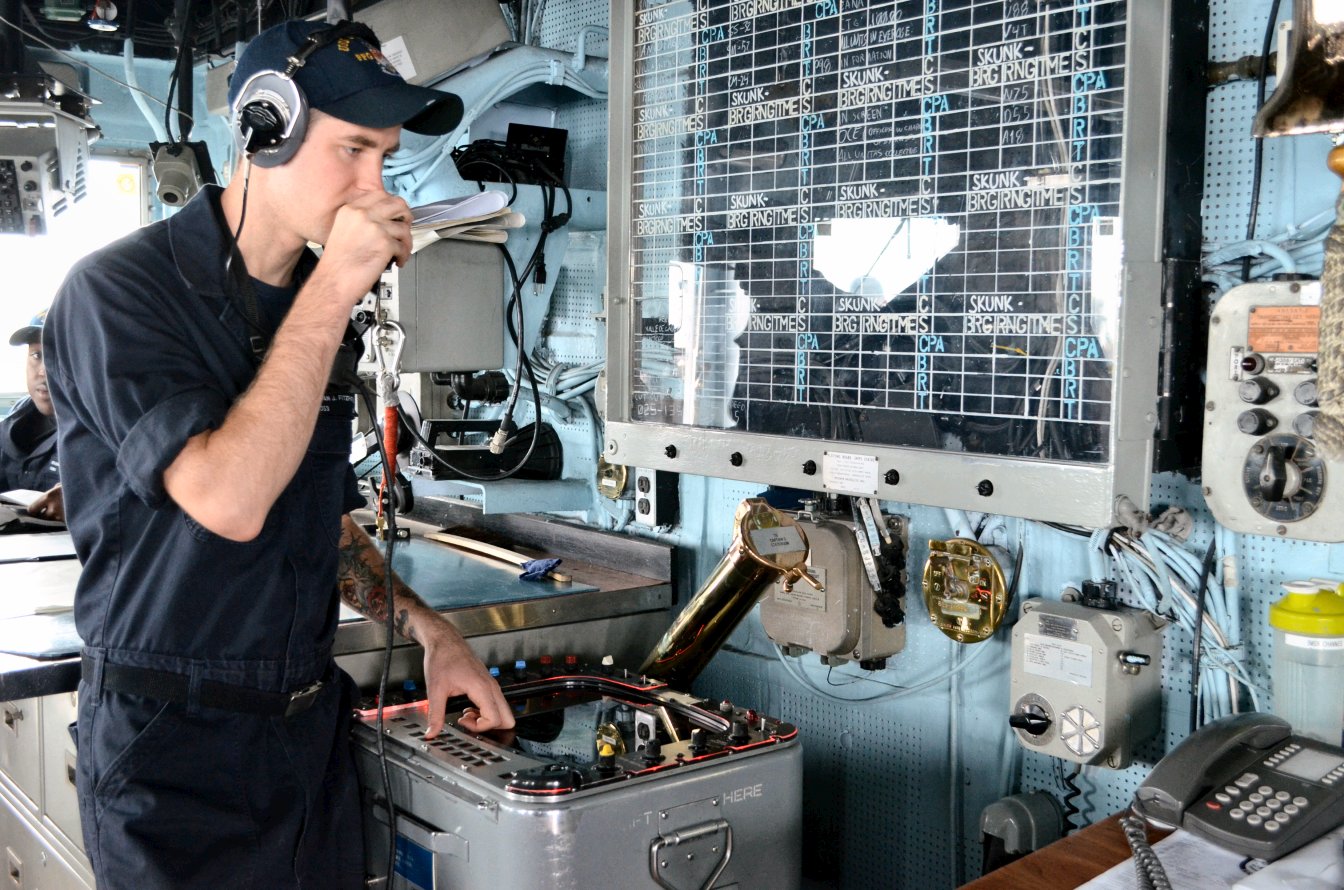297k | 24 September 2014: The Pacific Ocean - Operations Specialist 3rd Class Ryan Fitzpatrick relays messages via a sound powered phone aboard the guided-missile