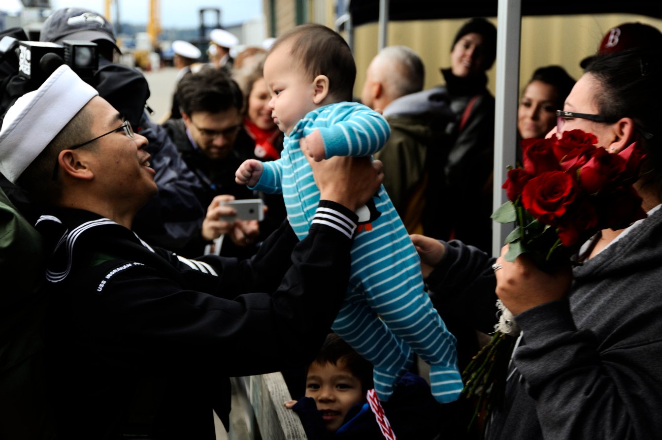 121k | 26 October 2014: Everett, Wash. - Ship's Serviceman Seaman Gary Luu, from Beaverton, Ore., greets his son following a deployment to the U.S. 4th Fleet