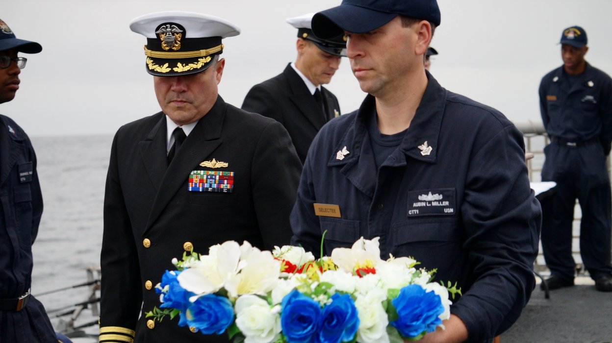 a wreath into the Pacific Ocean during a 9/11 memorial service Sept. 11, 2014. Terrorists hijacked four passenger aircraft Sept. 11, 2001. Two of the aircraft were deliberately crashed