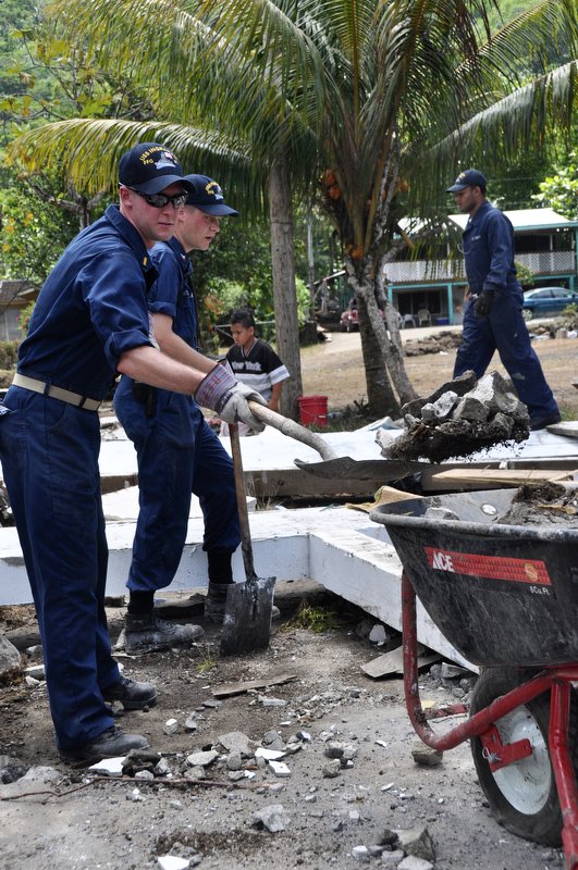 145k | 07 October 2009: Pago Pago, American Samoa - A sailor assigned to the guided-missile frigate USS Ingraham shovels rubble and debris