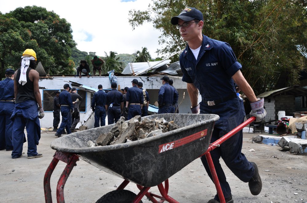 268k | 07 October 2009: Pago Pago, American Samoa - Sailors assigned to the guided-missile frigate USS Ingraham (FFG 61) clear away a damaged roof during