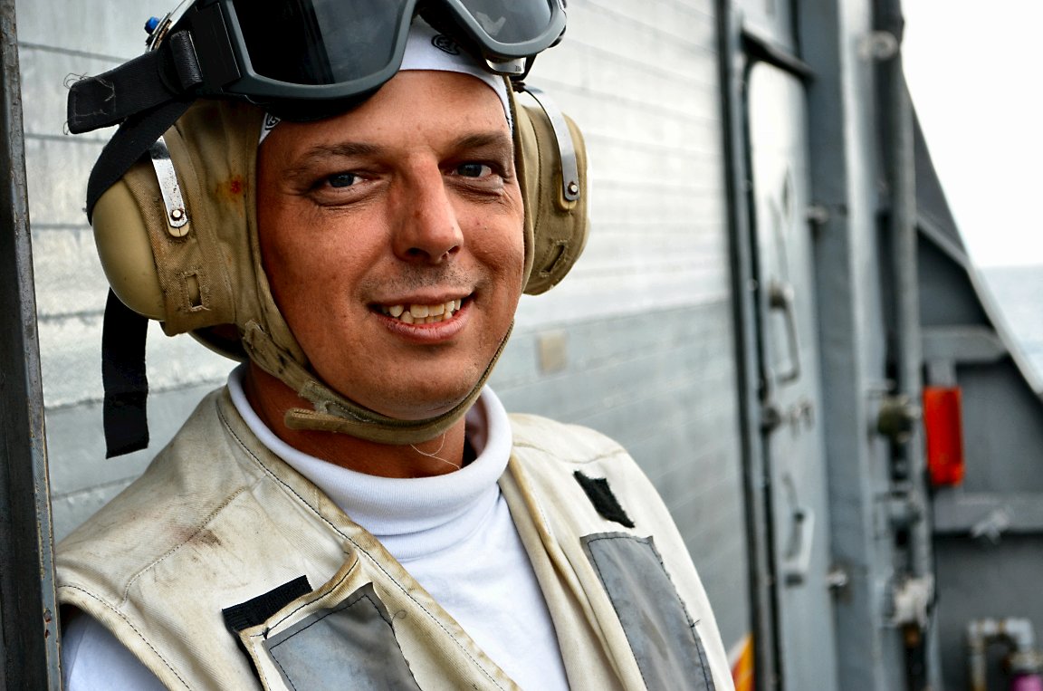 147k | 16 September 2014: at sea - U.S. Navy Chief Boatswain's Mate Shawn Boomer mans the flight deck during cross deck evolutions aboard the guided missile frigate Ingraham